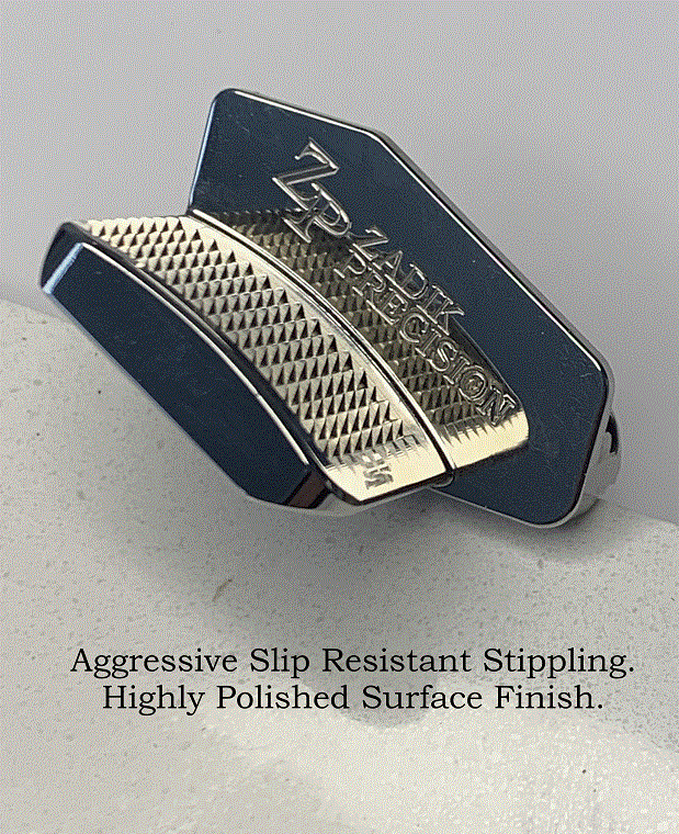 Specifically designed with a thumb placement angle which results in a natural comfortable grip for fast, accurate,  performance.  The aggressive stippling prevents thumb slippage giving you fantastic recoil control.  Each Slide Stop Thumb Rest is individually manufactured to very tight design tolerances, which results in minimal fitment.  There is absolutly no flexing encountered, the finish is highly polished and no tools required for removal. This Slide Stop Thumb Rest from Zadik Precision is superior in design and function to be used in USPSA, IDPA and IPSC.