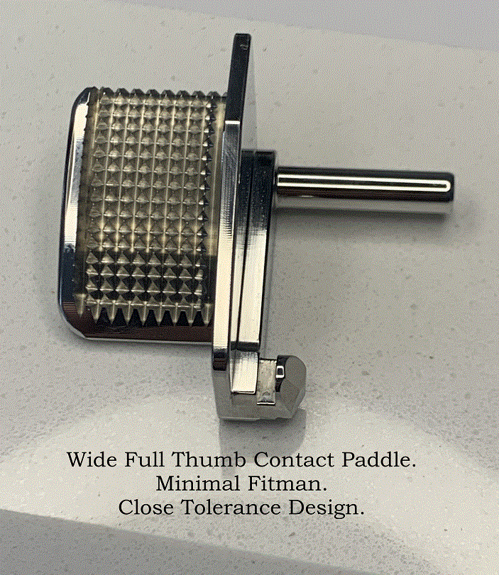 Slide Stop Thumb Rest Flat Paddle is preferred by competitor's wanting full control of recoil management. The flat paddle is wide for complete thumb contact, full aggressive stippling combats dirty, sweaty, oiled thumbs from slipping. with an angle that insures a natural comfortable grip. Available in Highly Polished Stainless Steel, DLC Black (Diamond Like Coating) and 24 K GOLD Hard Coat Finish.