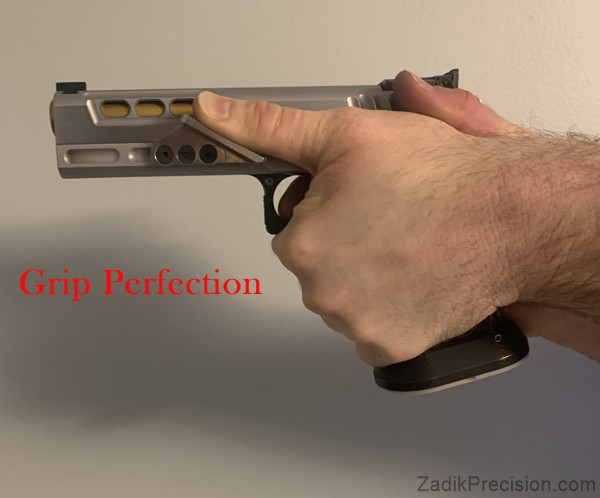 Now place both hands on the frame and to position test your grip, insure the thumb rest is clamped in the proper position, your support hand should be high on the firearm and your thumb pad should be centered along the bore of the barrel. Check to see if your thumb rests on the paddle naturally and comfortably. The bottom of the slide should be halfway along the full lenght of your thumb. If not adjust the thumb rest slightly for proper placement and test your grip aga