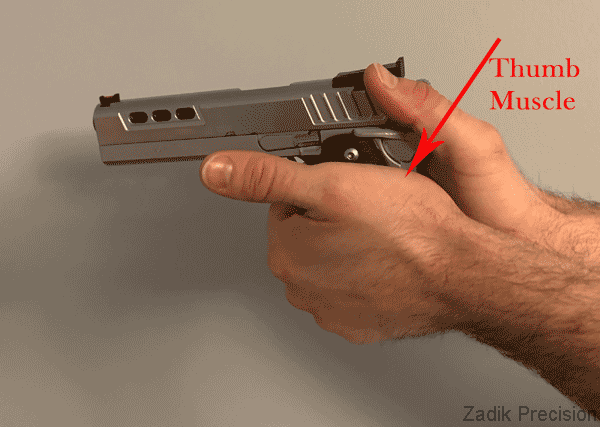 The thumb muscle is key to your support hand placement. Place your thumb muscle high on the frame as possible to still wrap your fingers under the trigger guard.